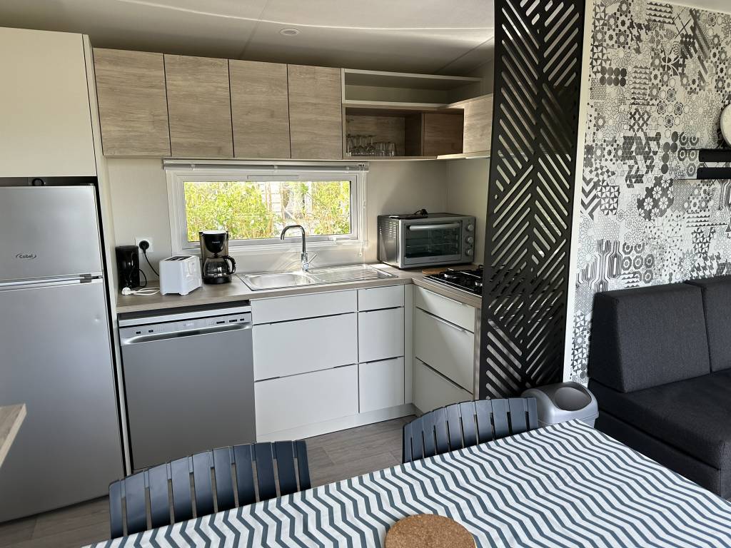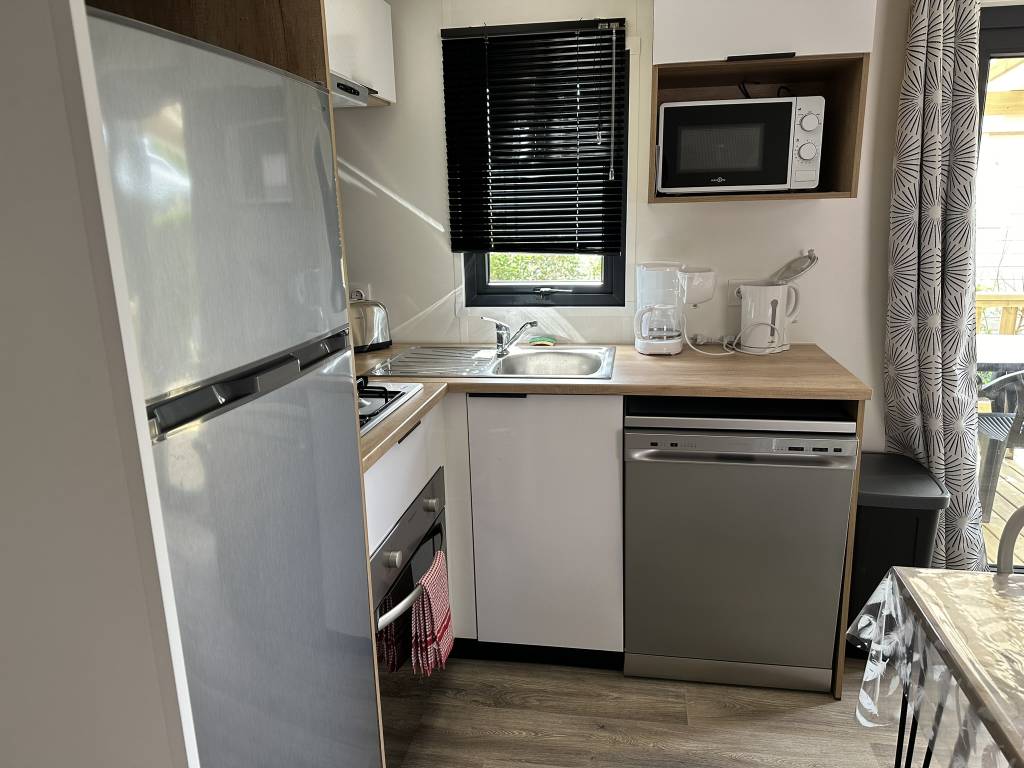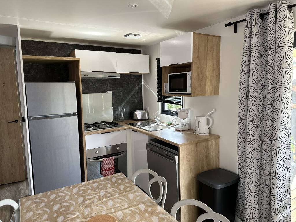 Néanmons, tous nos mobils home sont équipés de la vaisselle et des ustensiles de cuisine, d'une cafetière, d'un grille pain, d'une bouilloire, d'un four, d'une télévision, d'une terrasse avec salon de jardin, d'un barbecue.