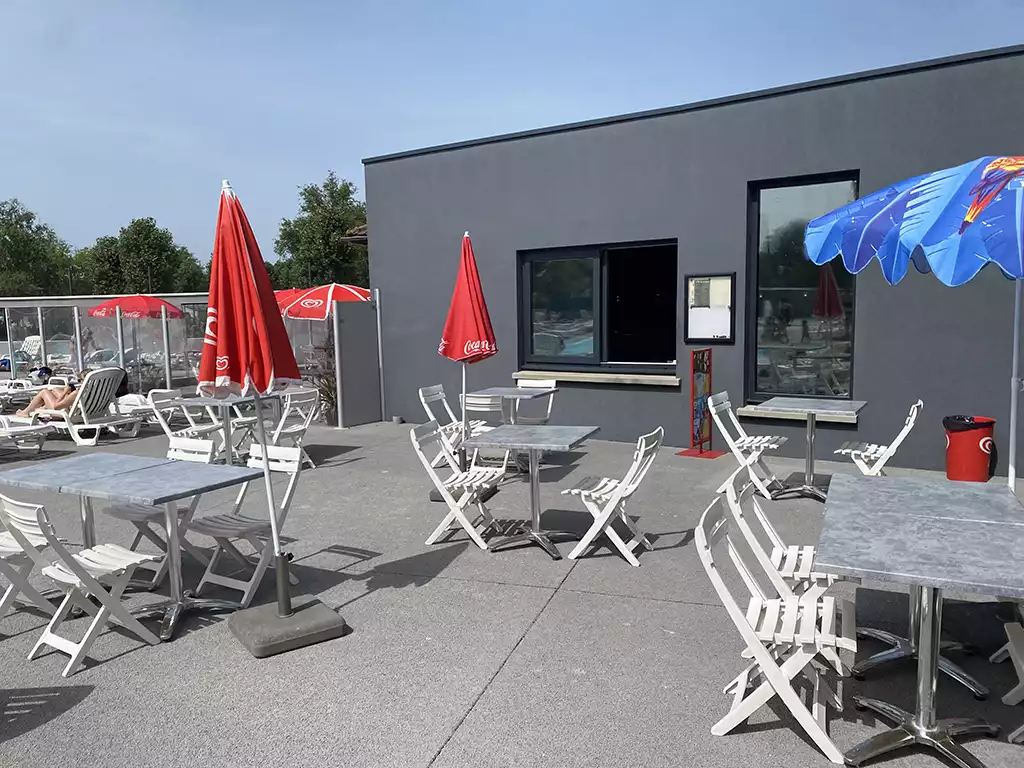 Ouvert tous les jours d'avril à octobre, le bar de la piscine vous propose des cocktails, des boissons, des crêpes, des gaufres, ... des glaces mais aussi des paninis et tacos.
